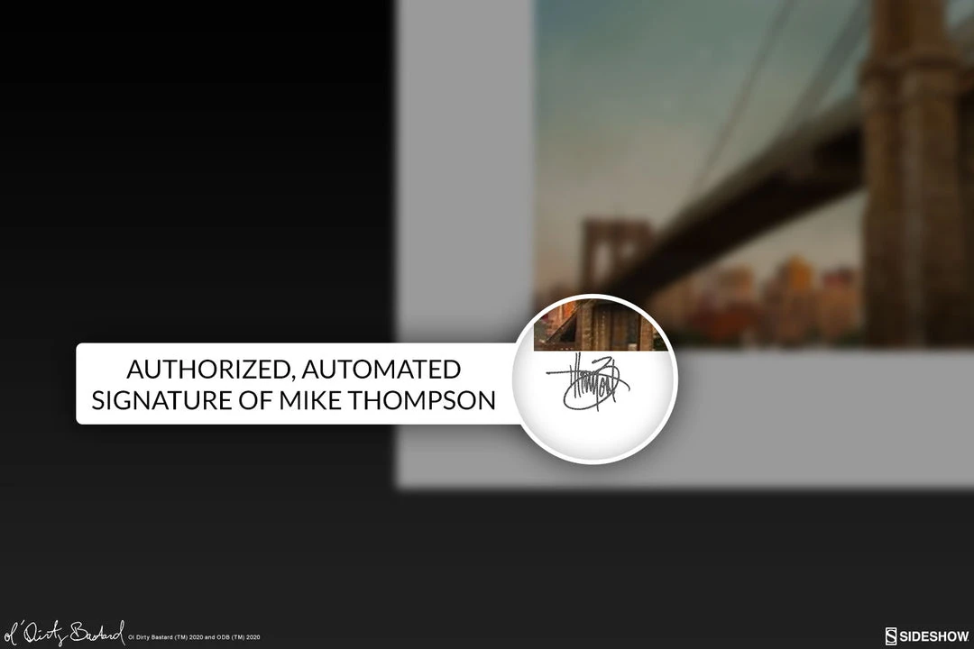 Each Ol’ Dirty Fine Art Print features an authorized, automated artist signature and an embossed Seal of Authenticity as a part of this limited edition, produced exclusively through Sideshow. This vibrant portrait is officially licensed by the ODB Estate and is a must-have for hip hop music fans everywhere.