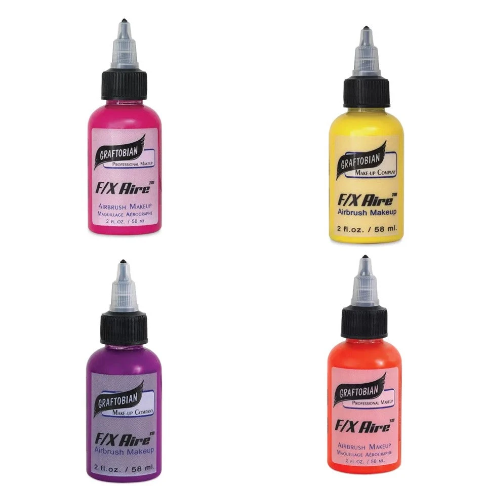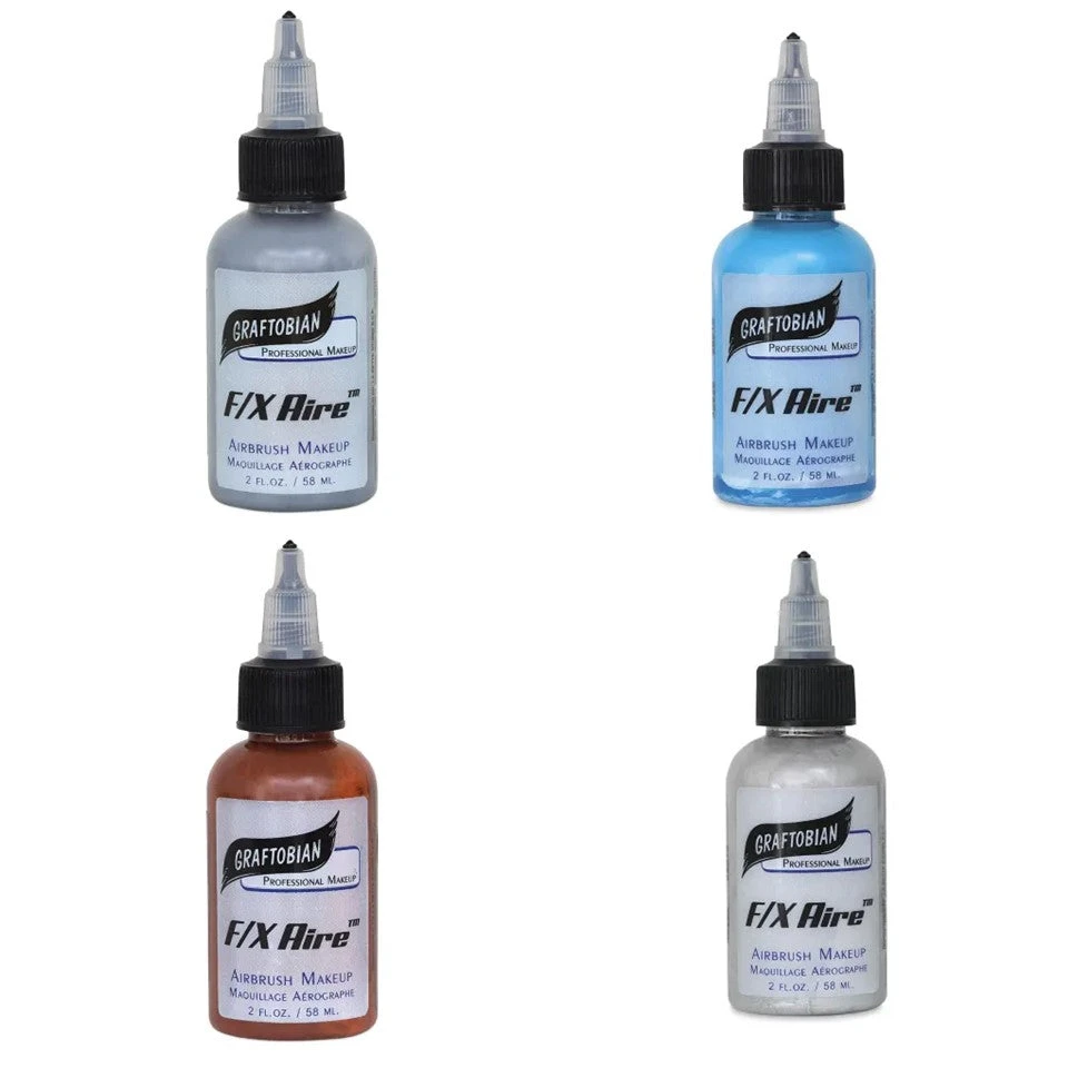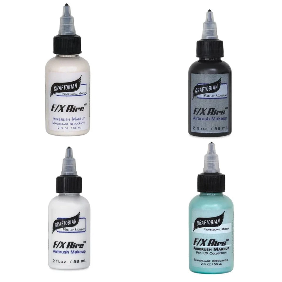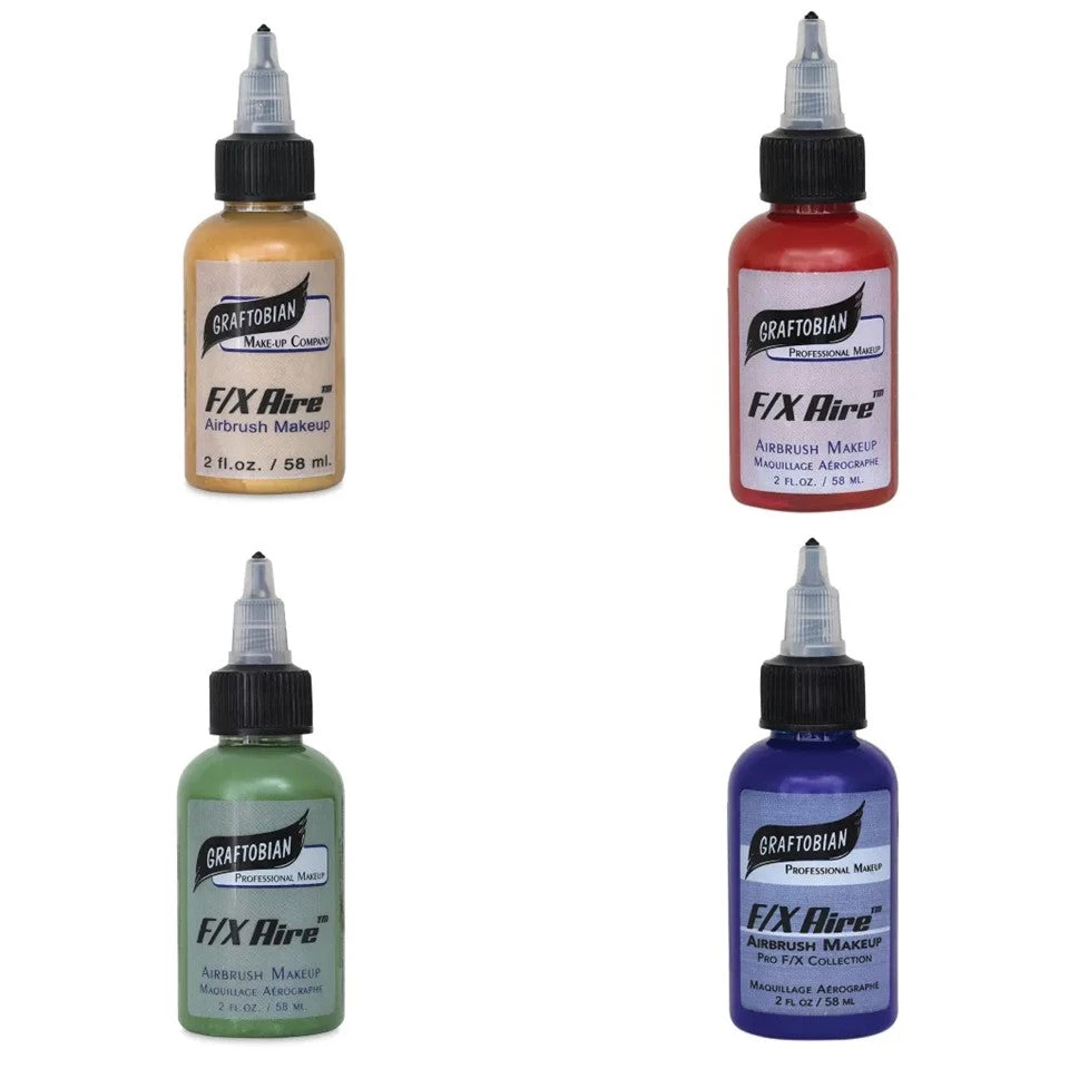 Professional-quality Graftobian F/X Aire Airbrush Face and Body Makeup is made with a hybrid water-alcohol formula that ensures long-lasting results. It goes on smooth and won’t clog your airbrush. This super-durable makeup is ideal for face and body art that needs to last 12–14 hours. It’s also good for long-lasting beauty and special effects applications. When the day is done, easily remove F/X Aire with soap and water. With its smooth, micronized formula, F/X Aire won’t clog airbrushes — even at low pressures. The makeup sprays on flawlessly at only 6–8 PSI. F/X Aire Airbrush Makeup comes in 2 oz (58 ml) bottles with dispenser caps. The colors mix and blend together beautifully. This makeup is vegan and made in the USA.