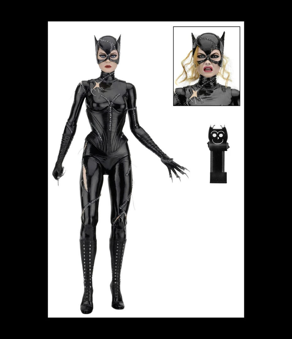The figure stands nearly 18โณ tall and features 30 points of articulation and a movie-authentic sculpt, detailed down to the loose threads hanging from her homemade costume. Catwoman comes with two interchangeable heads (one calm; one angry, with synthetic hair escaping from a battle damaged mask) and interchangeable hands, plus Taser and whip accessories.