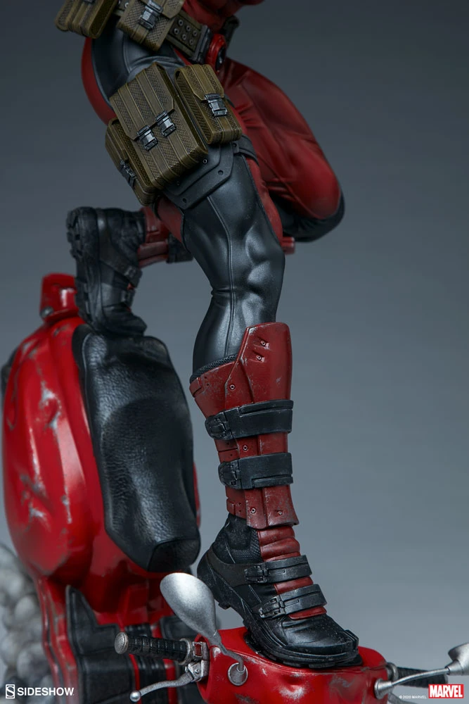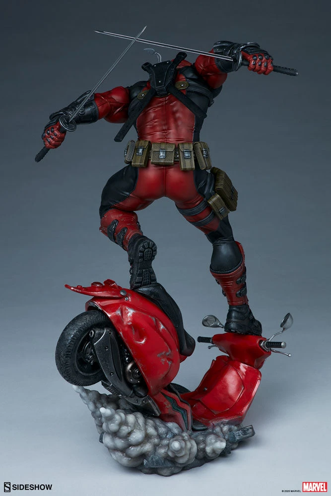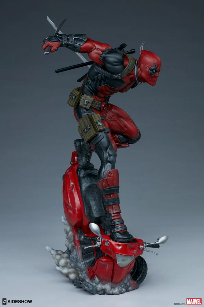 Coming in hot! The Deadpool Premium Format™ Figure measures 20.5” tall as Wade Wilson makes his epic entrance on a crashing red scooter, kicking up a cloud of smoke behind him. Deadpool comes brandishing his signature katanas, but also includes a pair of swap-out hands with fistfuls-o-utensils, just in case the Merc with a Mouth needs to knife, fork with, or even spoon the baddies.
