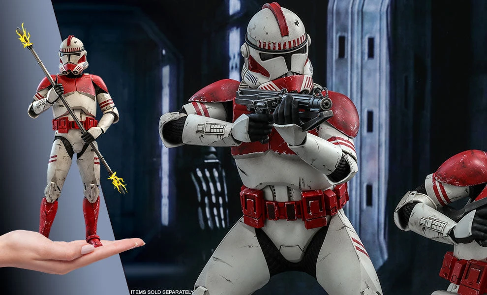 The highly detailed collectible figure features meticulously crafted and finely detailed recreation of Clone Trooper armor and helmet, Coruscant Guardās distinctive armor color with weather effects, an assortment of weapons, and a display base!