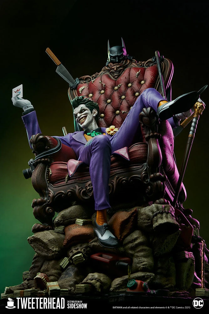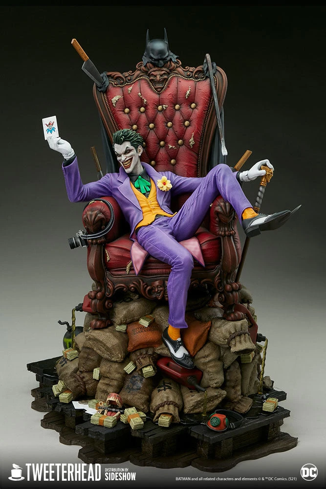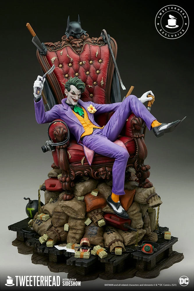 The Joker Deluxe Maquette measures close to 20.5β tall when fully assembled – from theΒ bottom of base to the tippy top of the Batmanβs cowl on the chair. This fully sculpted polyresin statue comes crammed with a bunch of craziness – Joker sitting atop his personalized throne with a Bat-cowl and cape, armed with his cane and bladed shoe. All nested on a giant pile of money bags, gasoline tanks, bombs, and endless knick-knacks and easter eggs, youβll probably never stop finding something new to love in this piece.